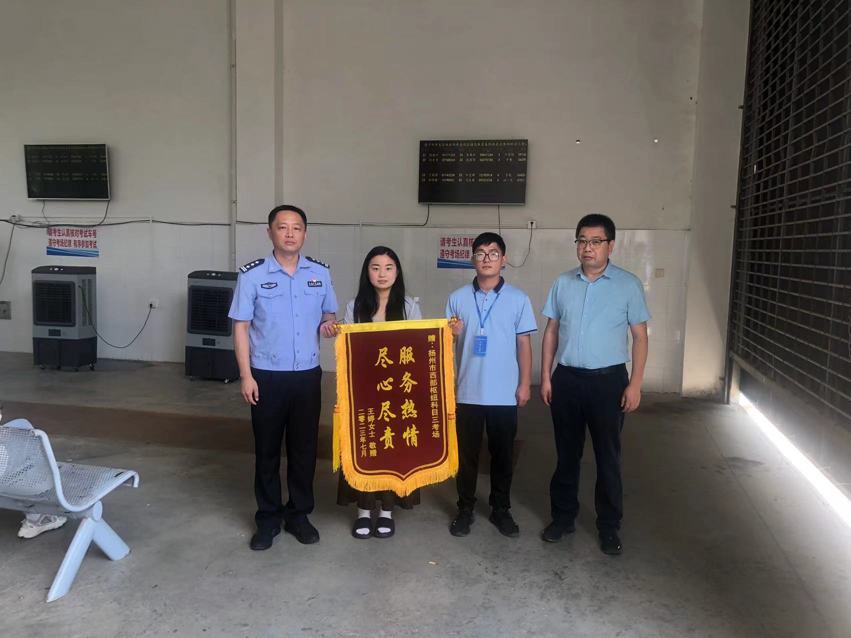 7月27日,揚(yáng)州西部客運(yùn)樞紐科目三考場(chǎng)收到了一面錦旗,印有“熱情服務(wù),盡心盡責(zé)”,王婷女士將錦旗交至車(chē)管所監(jiān)管人員和考場(chǎng)負(fù)責(zé)人手中,對(duì)現(xiàn)場(chǎng)工作人員的幫助表示感謝。